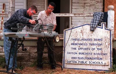 JIM WITMER DAYTON DAILY NEWSScott Lunce (left) and Jimmey Prather cut siding for the house under renovation in the background as part of the ISUS building project. |