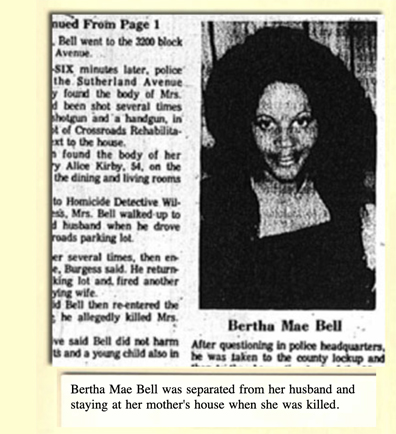 Next, Bell drove to the home of his wife's mother, Mary Alice Kirby, 54, in the 3200 block of Sutherland Avenue, and he pulled into the parking lot of the Crossroads Rehabilitation Center next door. His wife, Bertha Mae, came out of the house to confront him, and he shot her several times. Then he went inside the house and killed his mother-in-law in her dining room, and came outside and shot Bertha Mae again.