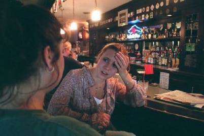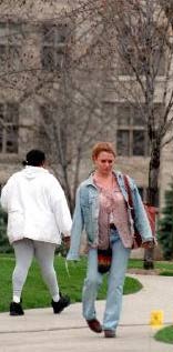 Leigh Clark talks with one of her friends, Laura Rako, at the