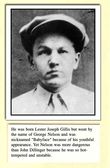 Nelson was Dillinger's opposite in personality. Dillinger seemed never to lose his composure, generally avoided shooting people, and left many of his victims feeling he was pretty decent fellow -- even if he did steal their cars and use them as human shields to escape the cops. The jittery and easily offended Nelson, on the other hand, shot people almost at random and resented getting less publicity than Dillinger.