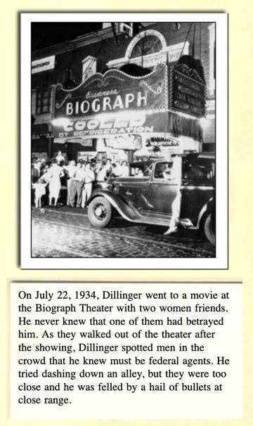 On July 22, after a home-cooked dinner and a game of Pinochle, Dillinger and his two female friends walked a few blocks from Anna's apartment to the Biograph Theater to see a Clark Gable movie about a fictional gangster. After the movie, as they walked among a crowd, Dillinger realized that several dark-suited men in the crowd were edging their way closer to him from all directions. He knew what was happening, though he probably still didn't suspect his friend had betrayed him. With a sudden bolt, he ran into an alley, but was shot down in a hail of bullets (some of which struck two passersby). He lay dying in the street as federal agents stood around him and was declared dead in the ambulance when it reached the hospital.