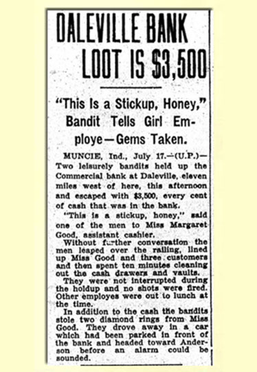 By mid-July, Dillinger was ready to graduate from store robberies to bank robberies. He'd lost some of the White Cap boys, including Shaw, who'd been picked up on suspicion by police, but on July 17, Dillinger and Harry Copeland robbed a bank in Daleville, Ind., and two days later a bank in Rockville.