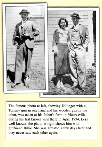 On April 6, 1934, Dillinger and Billie showed up at his father's farm in Mooresville and had a pleasant weekend visit with his extended family, sister Audrey and niece Mary among them. It was on that occasion that the famous photo was taken of Dillinger standing with a Tommy gun in one hand and his wooden gun in the other.