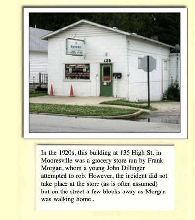 But a normal life of work and marriage was not sufficiently satisfying, and Dillinger began plotting a robbery with a shady acquaintance named Bill Singleton. Their target was Frank Morgan, who was in his 70s and ran a small grocery store in Mooresville. It was fairly well known that Morgan was in the habit of carrying his daily receipts home in his pocket at the end of each workday, and the plan was to rob him on the street as he walked home.