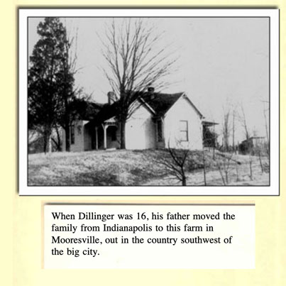 Johnnie Dillinger quit school at 16 to get a job. At about that time, John Sr. decided to move the family to a farm in Mooresville, a small town southwest of the city. John Jr. went along, but continued to work in Indianapolis, taking the interurban electric train each day until he got his first car.
