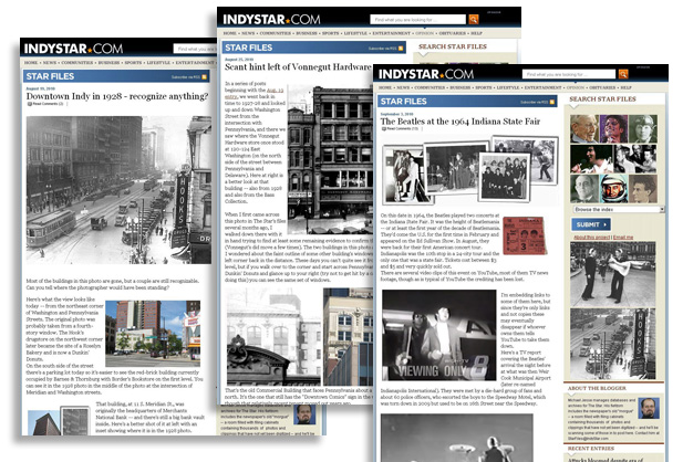 The StarFiles BlogAlthough I wrote lots of history items over the years, there was brief period of time when I had a local history blog. I only had it for a few months, but it became popular, and several posts got lots of comments. I was even interviewed on one of the local radio stations about it. Unfortunately, this opportunity only lasted a little while, and then the entire IndyStar.com site went through a corporate redesign that made it impossible for rogue players like me to insert our own HTML code to enhance display. Not that I blame them. It was just a logical thing for them to do in order to make a large website uniform, but it took a lot of the value out of it for me, and I gave up the blog and just produced occasional history items as regular IndyStar articles and photo galleries. |