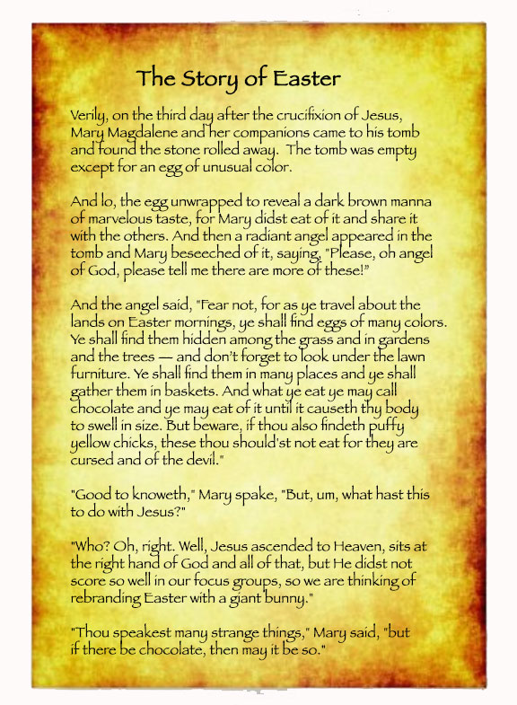 I included this in a box of Easter candy that I sent to a Muslim friend one year, so she would not feel left out.