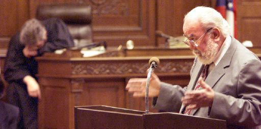 Greene CountyCommon Pleas Judge Thomas M. Rose rests his head on the bench as he listens toJames R. Taylor's opening statements in his capital murder case Wednesday.Judge Rose had to interrupt the 17-minute presentation nine times when Taylor,who is defending himself, strayed beyond legal bounds. BILLREINKE / DAYTON DAILY NEWS