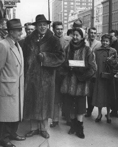Right: Lou Emm joined the staff at WHIO on Oct. 22, 1941, as anannouncer and news reader. His `Man on the Street' series beganairing on TV in October 1951. It ran 15 minutes, 5 days a week.