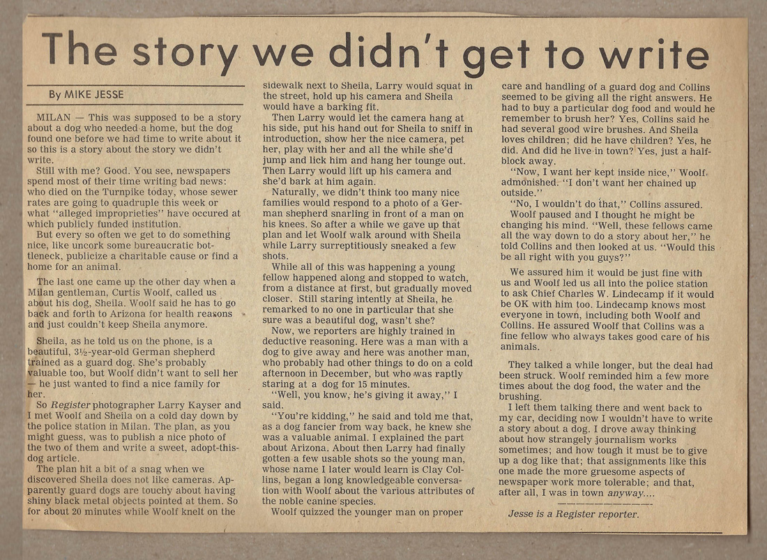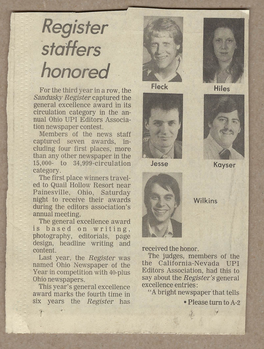 I initially went to Sandusky on a three-month internship, which was my last academic requirement to complete my degree, and I still have the weekly internship reports I sent back to my professors. When the internship period was over, the Register hired me as a regular staffer.